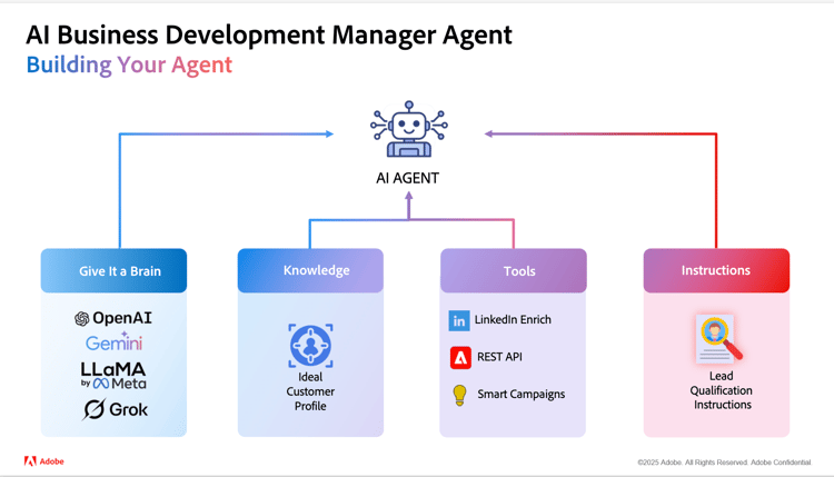 3. Next, we provide Tools. These are the things the AI can use to do its job — like calling a LinkedIn enrichment API, querying lead activity from Marketo Engage, or triggering a Smart Campaign using Marketo’s REST API.