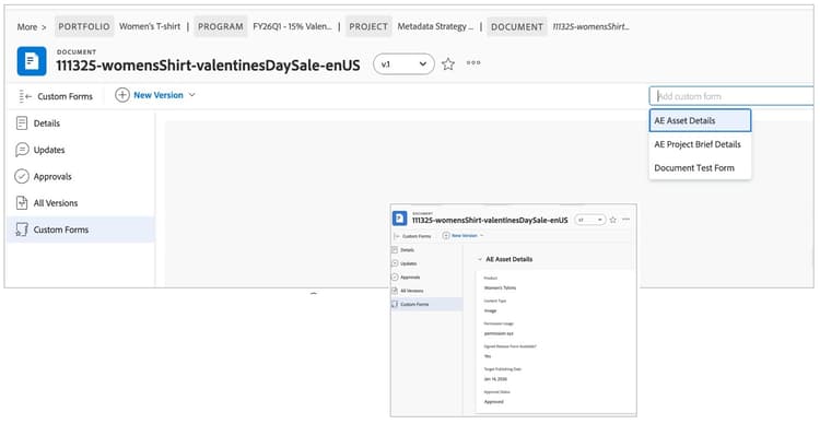 Workfront Custom Forms are created with all metadata for the project and asset.