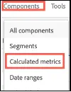 To open the Calculated Metrics Builder, use the top navigation to click →  Components  →  Calculated Metrics  →  + Add.  Or, you can click the  + sign  above  Metrics in the Components panel.