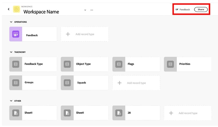 A workspace is comprised of operational record types and taxonomy record types. While a workspace refers to the collection of operational record types and/or taxonomy record types, you are adding records to share out with team members in an operational record type. Taxonomy record types are used to add additional details to operational record types. For instance, a table for meeting notes is created using an operational record type, and this record type serves as a core part of the workspace. Then, you can use taxonomy records to serve as customizable labels add over and over. You can create a business unit taxonomy that contains values like Marketing, Engineering, and Sales.