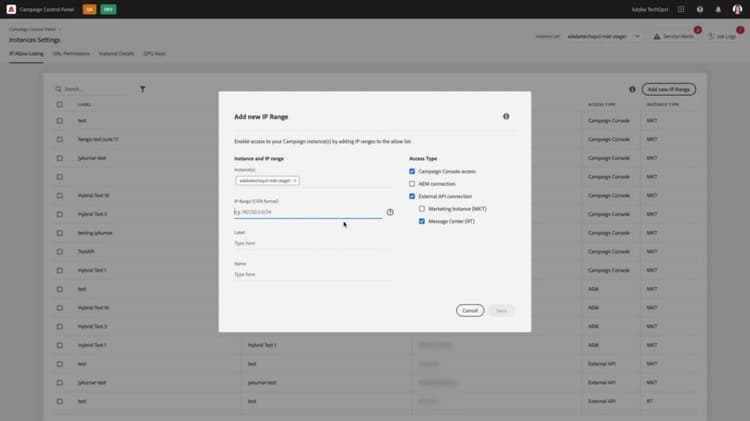 Learn how to add an IP range to Adobe Campaign instances' allowlists and how to remove them from the allowlist using the control panel.