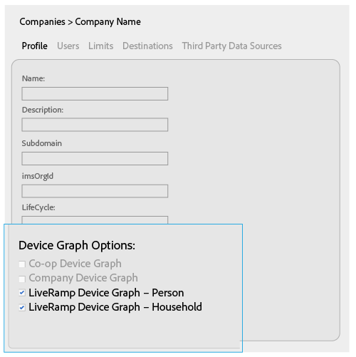 Estas casillas de verificación están habilitadas en Admin UI cuando un socio crea un Data Source y selecciona Use as an Authenticated Profile y/o Use as a Device Graph. Los nombres de esta configuración están determinados por el proveedor de gráficos de dispositivos de terceros (por ejemplo, LiveRamp, TapAd, etc.). Cuando se selecciona, significa que la empresa que está configurando utilizará los datos proporcionados por estos gráficos de dispositivos.