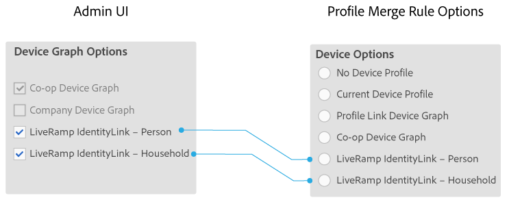 Las opciones de gráfico de dispositivos que seleccione aquí muestran u ocultan las opciones Device Options disponibles para un cliente Audience Manager cuando crea un Profile Merge Rule.