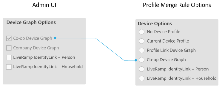 Los clientes que participan en Adobe Experience Cloud Device Co-op utilizan estas opciones para crear Profile Merge Rule con datos determinísticos y probabilísticos. Corporate Provisioning Team activa y desactiva esta opción mediante una llamada de back-end API. No puede marcar ni desactivar estas casillas en Admin UI. Además, las opciones Co-op Device Graph y Company Device Graph se excluyen mutuamente. Los clientes pueden pedirnos que activemos uno o el otro, pero no ambos. Si se marca esta opción, se expone el control Co-op Device Graph en la configuración de Device Options para un(a) Profile Merge Rule.
