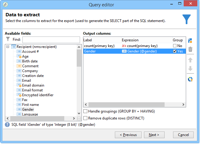 En Data to extract, defina un recuento para la clave principal (como se muestra en el ejemplo anterior). Añada el campo Gender en la columna de salida. Marque la opción Group en la columna Gender. De este modo, los destinatarios se agrupan por género.