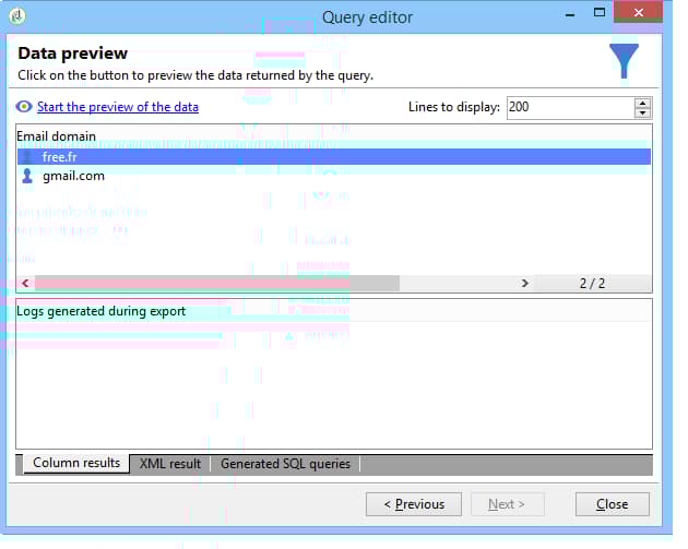 En la ventana Data to extract, seleccione los campos Email domain y Primary key. Ejecute un recuento en el campo Primary key.