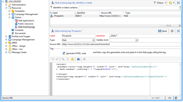 Este método permite definir manualmente las páginas de las que se debe realizar un seguimiento y generar un ejemplo de la etiqueta de seguimiento web asociada. Esta operación está definida en el nodo Campaign execution>Resources>Web tracking tags de la consola del cliente.