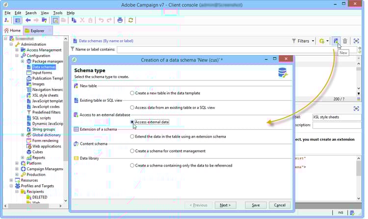 Haga clic en el botón New sobre la lista de esquemas de datos y elija Access external data.