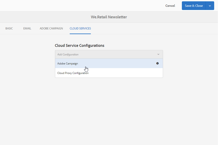 En la pestaña Cloud Services, seleccione Adobe Campaign como Cloud service configuration y la instancia de Adobe Campaign en la segunda lista desplegable.