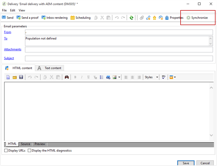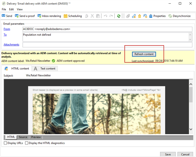 En la lista desplegable Delivery template , seleccione la plantilla Email delivery with AEM content (mailAEMContent) .