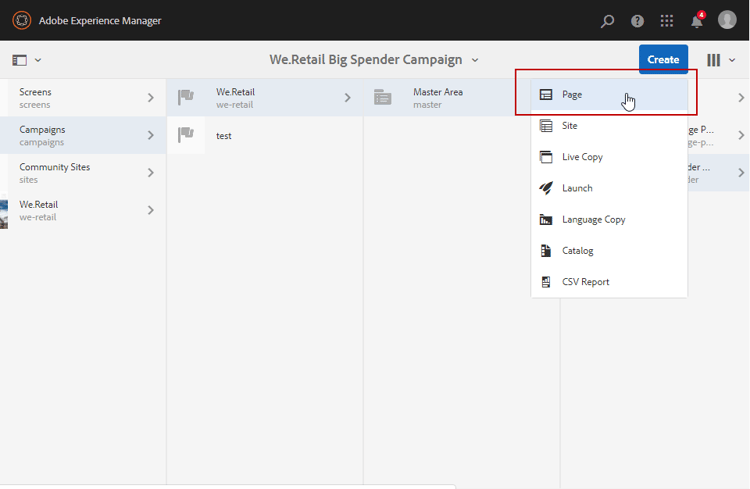 Haga clic en el botón Create situado en la parte superior derecha de la página y seleccione Page.