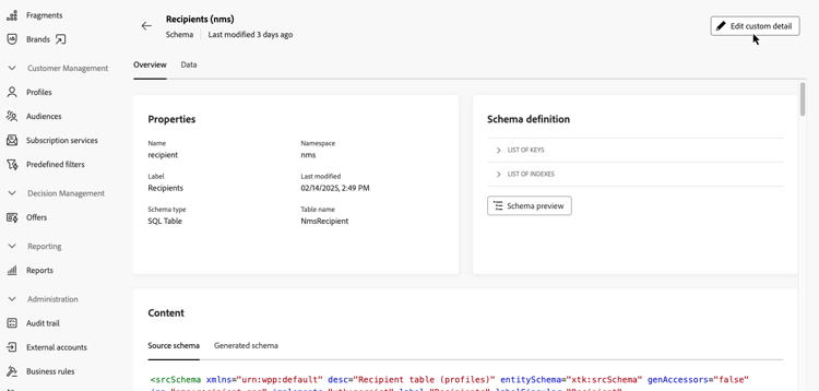 Seleccione el nombre del esquema en la lista para abrirlo. Se muestra una vista de esquema detallada. Más información acerca de los detalles del esquema. Haga clic en el botón Edición en pantalla para acceder a los campos personalizados. En este ejemplo, se agregan campos para el esquema Recipients.