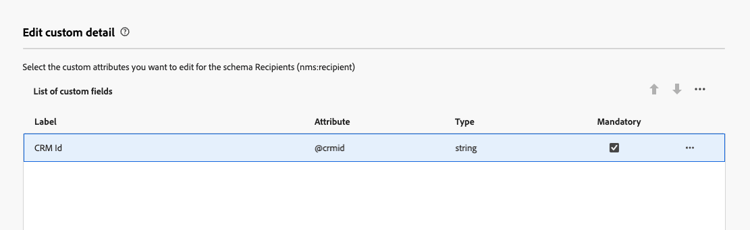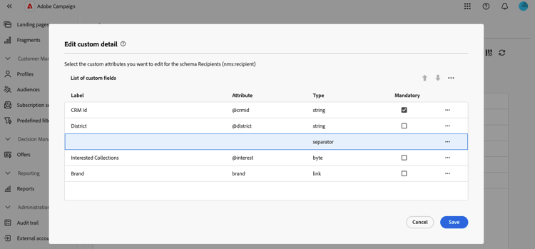 Los campos personalizados son atributos adicionales añadidos a los esquemas predeterminados a través de la consola de Adobe Campaign. Permiten personalizar esquemas incluyendo nuevos atributos para adaptarlos a las necesidades de la organización. Obtenga información sobre cómo ampliar un esquema en la documentación de Adobe Campaign v8.