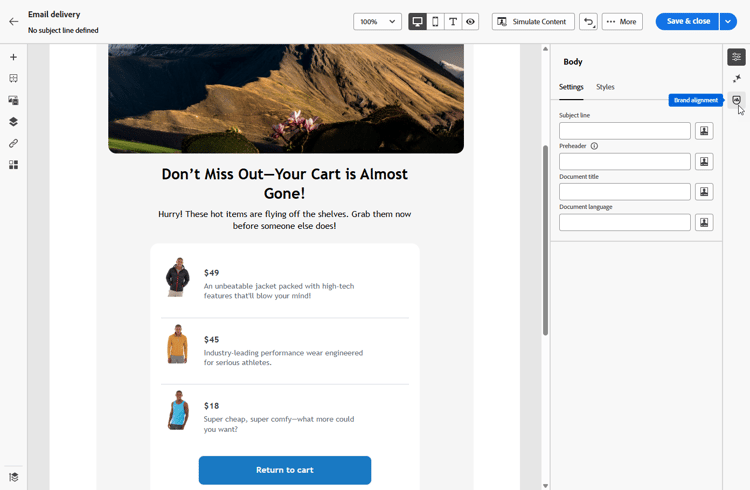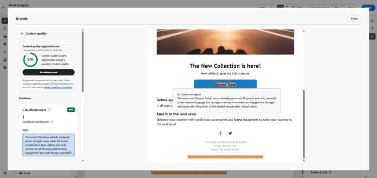 Una vez configurada y publicada su marca, evalúe la puntuación de alineación de marca directamente dentro de su campaña de correo electrónico para asegurarse de que el contenido se ajuste a las directrices de marca: