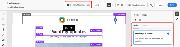 Puede activar el bloqueo de contenido para una plantilla de correo electrónico directamente en la Designer de correo electrónico, tanto si está creando una plantilla nueva como si está editando una existente. Siga estos pasos: