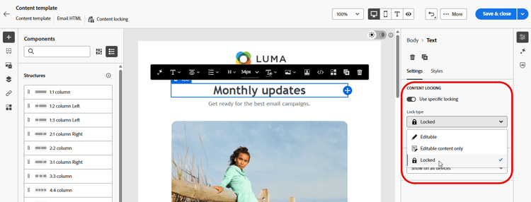 En la lista desplegable Bloquear tipo, elija Editable. Para permitir la edición de contenido al bloquear estilos, seleccione Solo contenido editable. Aprenda a bloquear componentes