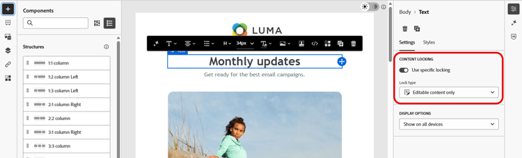 - Los componentes de contenido individuales dentro de la estructura bloqueada se pueden establecer como editables.
