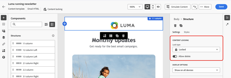 Adobe Campaign permite bloquear el contenido en plantillas de correo electrónico, ya sea bloqueando toda la plantilla o estructuras y componentes específicos. Esto evita ediciones o eliminaciones involuntarias, lo que le proporciona un mayor control sobre la personalización de las plantillas y mejora la eficacia y fiabilidad de sus campañas de correo electrónico.