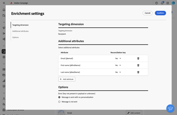 Esta capacidad le permite personalizar mensajes transaccionales vinculando campos de base de datos de Adobe Campaign al contenido del mensaje. Puede seleccionar asignaciones de destino, columnas de enriquecimiento y una clave de reconciliación para garantizar una personalización precisa y en tiempo real mientras mantiene los umbrales de rendimiento.