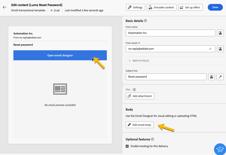 En la sección Contenido, haga clic en el botón Editar contenido y defina el contenido del mensaje. Consulte esta página.