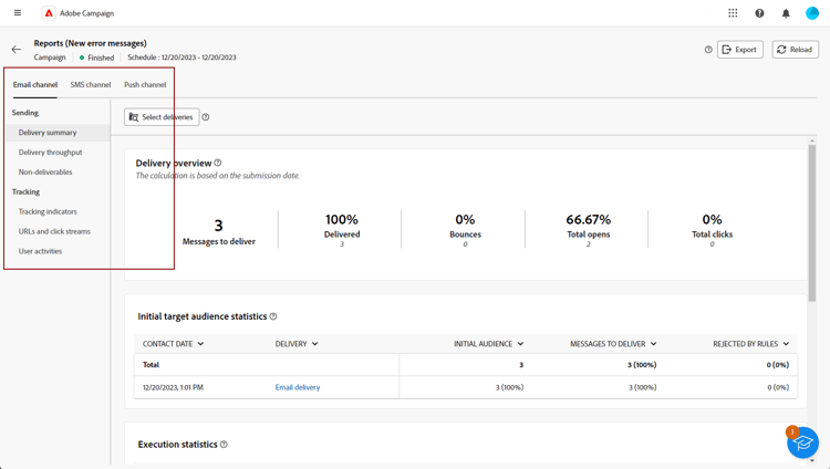 En el menú de la izquierda, seleccione un informe de la lista y navegue por las pestañas para mostrar los datos de cada canal.