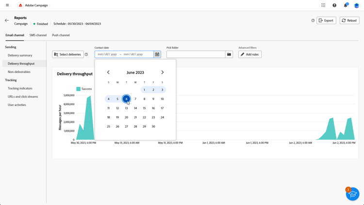 En el menú Rendimiento de entrega, elija un Inicio y Hora de finalización para centrarse en datos específicos.
