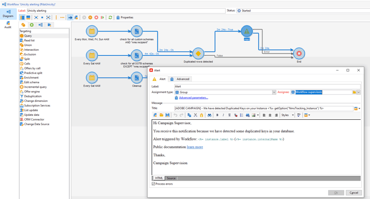 Se envía una notificación específica al grupo de operadores Workflow Supervisors cuando se detectan claves duplicadas. El contenido y la audiencia de esta alerta se pueden cambiar en la actividad Alerta del flujo de trabajo Unicity alerting.