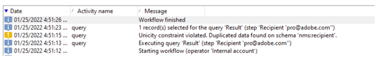 Cuando un flujo de trabajo empieza a ejecutar una consulta en un esquema, Adobe Campaign comprueba si se ha informado de algún registro duplicado en la tabla de unicidad de auditoría. Si es así, el flujo de trabajo registra una advertencia, ya que la operación posterior en los datos duplicados podría afectar al resultado del flujo de trabajo.