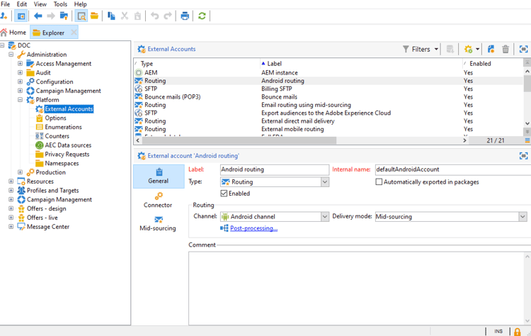 Puede acceder a cuentas externas desde Adobe Campaign Explorer: vaya a Administration > Platform > External accounts.