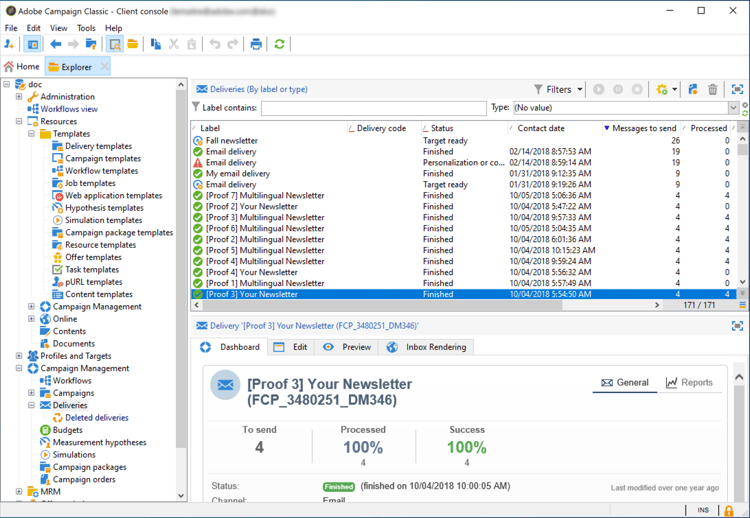 Puede acceder a las entregas desde la lista de entregas a través del nodo Campaign Management > Deliveries del árbol.