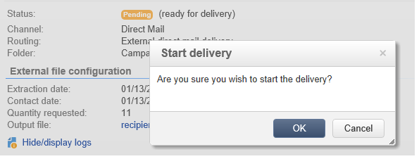 En el contexto de una campaña de marketing, cuando se han concedido todas las aprobaciones, los archivos de extracción se crean mediante un flujo de trabajo especial que, en una configuración predeterminada, se inicia automáticamente cuando una entrega de correo directo está pendiente de extracción. Obtenga más información en esta sección.