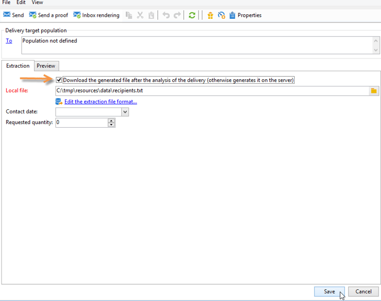 De forma predeterminada, el archivo de extracción se crea y se almacena en el servidor. Puede guardarlo en el equipo. Para ello, marque la Download the generated file after the analysis of the delivery. En este caso, es necesario indicar la ruta de acceso al directorio de almacenamiento local así como al nombre de archivo.