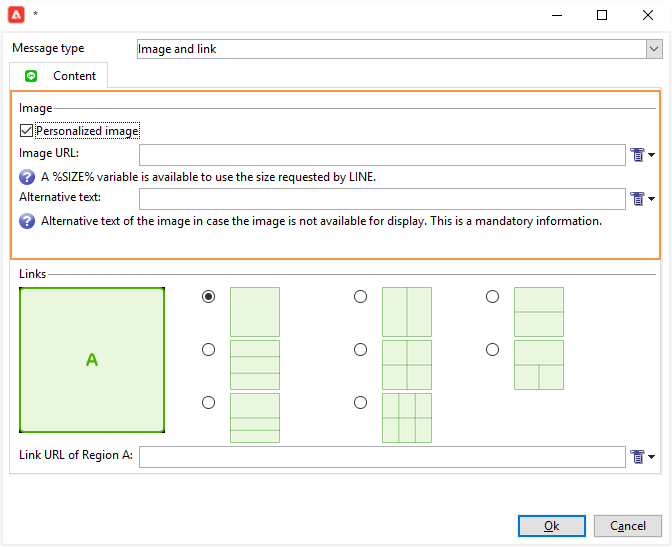 La sección Links le permite elegir entre diferentes diseños que dividen la imagen en varias regiones en las que se puede hacer clic. A continuación, puede asignar a cada una de ellas un Link URL dedicado.