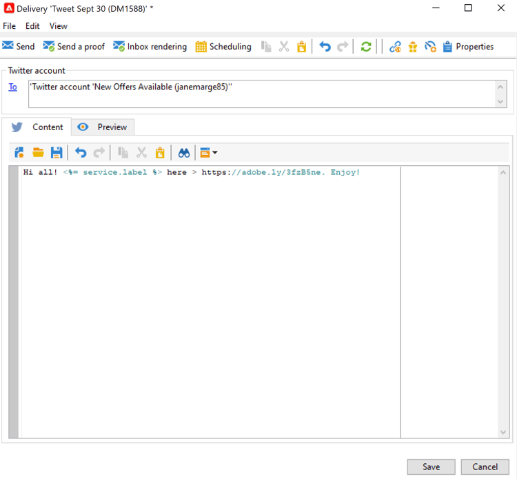 note note NOTE Si está utilizando la misma cuenta de prueba X para todas las entregas, puede guardar el objetivo de prueba en la plantilla de entrega Tweet, a la que se accede mediante el nodo Resources > Templates > Delivery templates. El objetivo de la prueba se especifica de forma predeterminada para cada nueva entrega. -