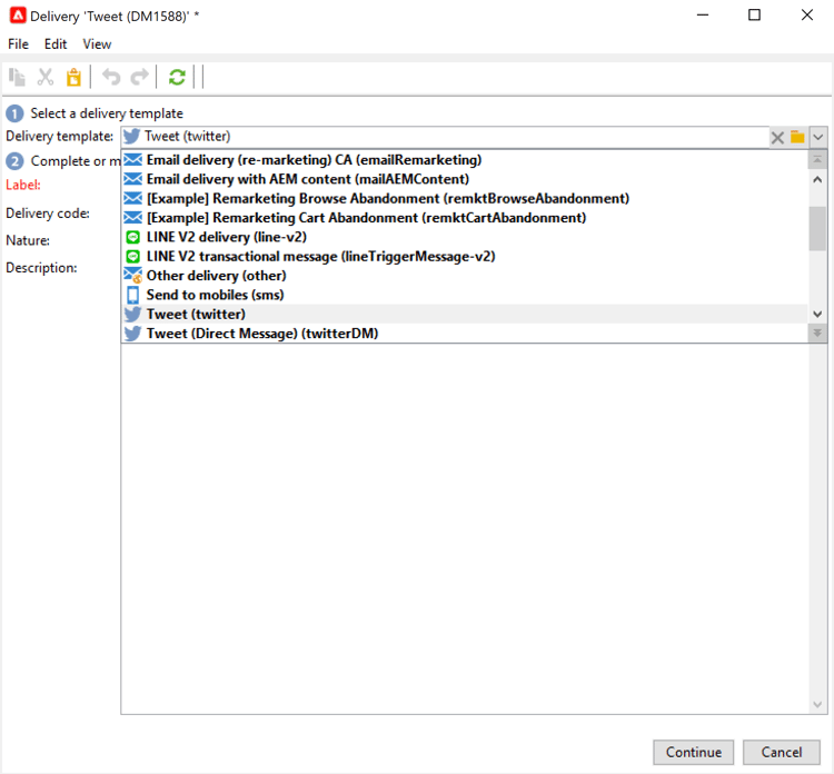 Cree una entrega X basada en la plantilla de envíos integrada Tweet (Direct Message).