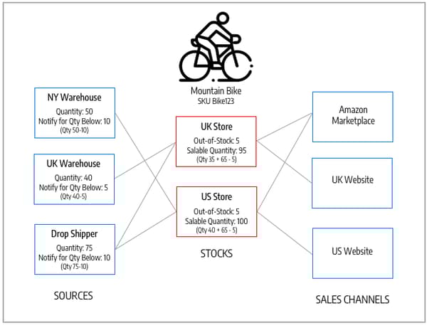 El siguiente diagrama ayuda a definir el funcionamiento de un Stock en relación con las Fuentes y Sales Channel de un comerciante de tienda de bicicletas.