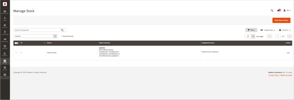 Comience con un Stock predeterminado que no se puede eliminar ni deshabilitar. Solo puede añadir canales de ventas adicionales a las existencias. El único origen asignado es Source predeterminado. Este stock lo utilizan comerciantes de un solo origen, integraciones de terceros y productos importados.
