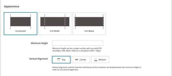 table 0-row-2 1-row-2 2-row-2 3-row-2 layout-auto Opción Descripción Contained El color de fondo o la imagen están limitados al ancho de página máximo definido por la temática. Full Width Limita el contenido al ancho de página máximo definido por la temática. El color de fondo o la imagen no están limitados y amplían el ancho completo de la fila. Full Bleed El contenido, la imagen de fondo o el color no están limitados y amplían el ancho completo de la fila. La opción de sangrado completo solo se puede usar con temas que admitan el diseño. -