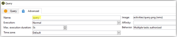 El nombre de la actividad se puede encontrar en la pestaña Advanced. Evite poner nombres como query, query1, query11, asígneles nombres explícitos como querySubscribedRecipients. Este nombre se muestra en el historial y, si procede, en los registros SQL, lo que le ayuda a depurar el flujo de trabajo al configurarlo.
