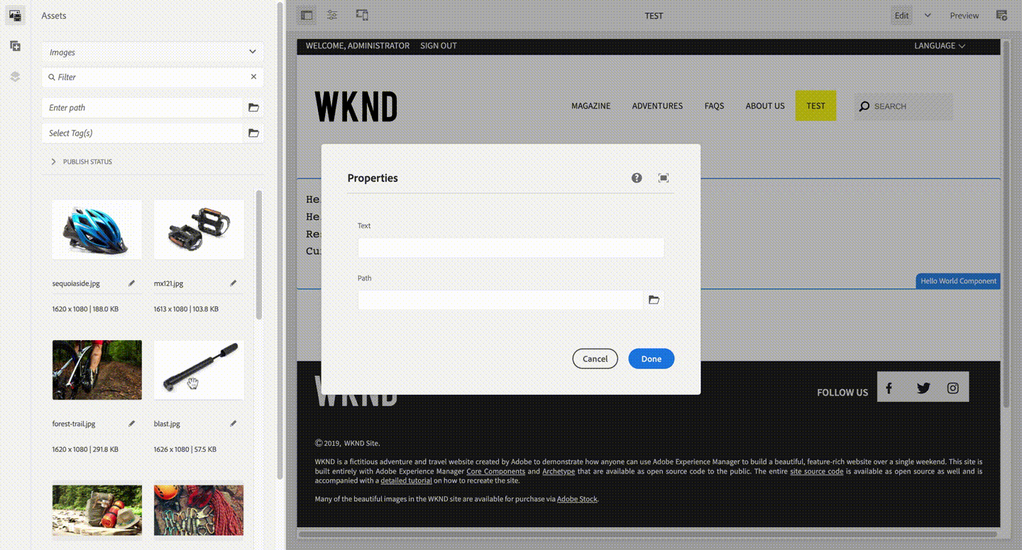 Un PathField con droppable=true, agregado al componente HelloWorld del tutorial WKND, como