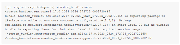 AEM Sin embargo, en su caso, la explicación más plausible para esto podría ser que la instancia de la instancia de la instancia aún está ejecutando el paquete de la versión cq.wcm.core.components, ligeramente obsoleto, que está exportando una versión anterior de com.adobe.cq.wcm.core.components.util y com.adobe.cq.wcm.core.components.models.