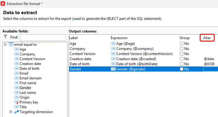 2. Compruebe si se ha aplicado un alias a algún campo de enumeración en el formato del archivo de salida. Para ello, haga clic en la opción Editar formato de archivo de la actividad Extracción de datos y busque los valores en el campo Alias en el lado derecho de la ventana. Para ver los pasos, consulte Extracción de datos (archivo) en la Guía de automatización de Campaign.