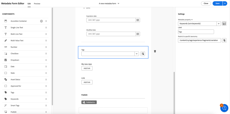 Cómo trabajar con el componente Etiquetas en el formulario de metadatos tag-component-metadata-form