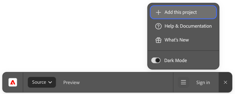 Vaya a una dirección URL de proyecto (similar a https://main--repo--owner.aem.page/), haga clic en el menú contextual (≡) en Sidekick y seleccione Agregar este proyecto.