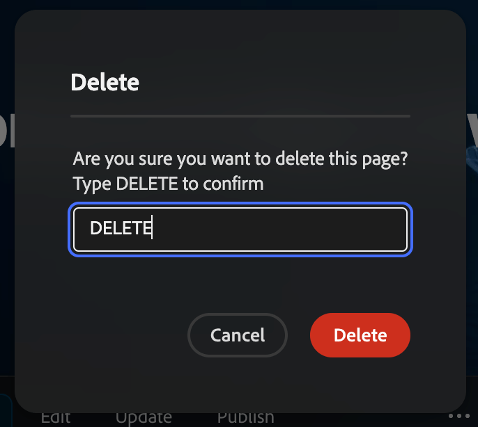 Debido a la firmeza de eliminar páginas, debe confirmar la eliminación introduciendo DELETE en un cuadro de diálogo.