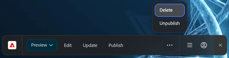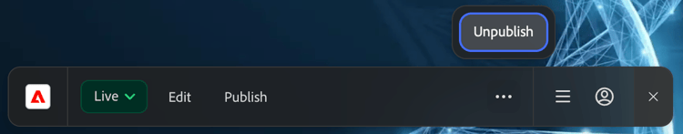 Dado que la cancelación de la publicación y la eliminación no son tan comunes como la previsualización y la publicación de contenido, estas opciones se mantienen detrás de un menú de puntos suspensivos, que solo se muestra cuando corresponde. Vaya a una página publicada o a su vista previa y haga clic en el botón de puntos suspensivos de Sidekick para mostrar la opción Cancelar la publicación.