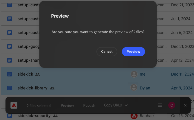 Abra Sidekick en Google Drive o Microsoft SharePoint y seleccione uno o más archivos para previsualizar y publicar archivos de forma masiva y copiar convenientemente sus direcciones URL. Sidekick cuenta el número de archivos seleccionados y le solicita que confirme cualquier acción masiva.