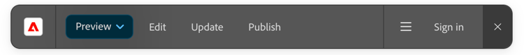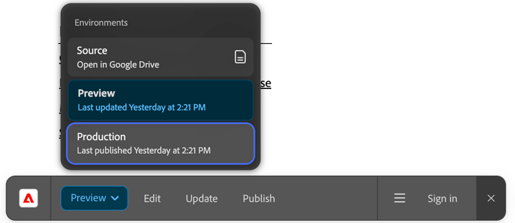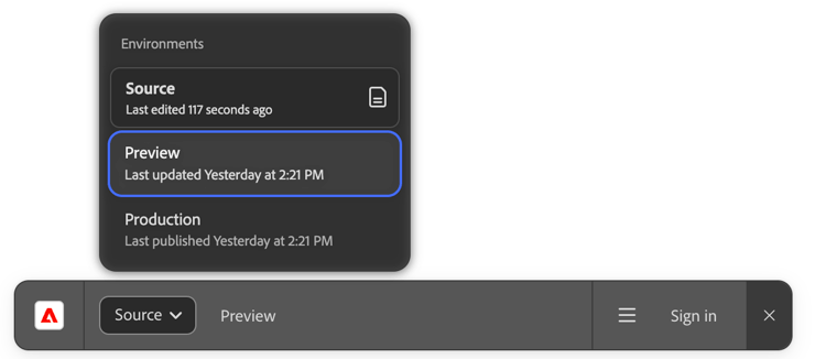 El entorno de vista previa refleja los cambios más recientes de la página representada desde el documento de origen. Los entornos de vista previa se indican con una etiqueta azul. Puede enviar direcciones URL de vista previa a las partes interesadas para que puedan revisar el contenido antes de que se publique. Tenga en cuenta que esta opción solo está habilitada si el contenido que está viendo ya se ha previsualizado anteriormente.