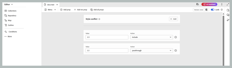 Para añadir un número de revisión específico a una etiqueta en XML, se puede utilizar la opción Add rev prop. Esto añade un atributo rev a la etiqueta, con el valor definido en el campo Valor junto con la acción seleccionada para la propiedad. Este atributo de revisión se puede utilizar posteriormente para filtrar el contenido XML relevante en función del número de revisión especificado al generar la salida.