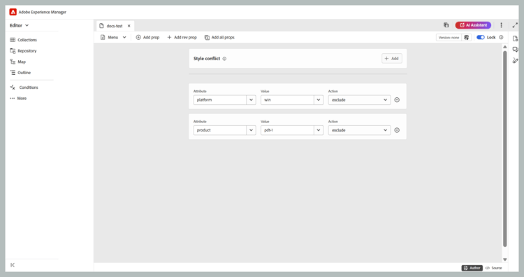 Autor: Esto es una vista típica de Lo que se ve es lo que se obtiene (WYSISYG) del editor DITAVAL. Puede agregar o quitar propiedades mediante la interfaz de usuario simple, que presenta las propiedades, sus valores y las acciones en la lista desplegable. En la vista Autor, tiene las opciones para insertar una propiedad individual e insertar todas las propiedades con un solo clic.